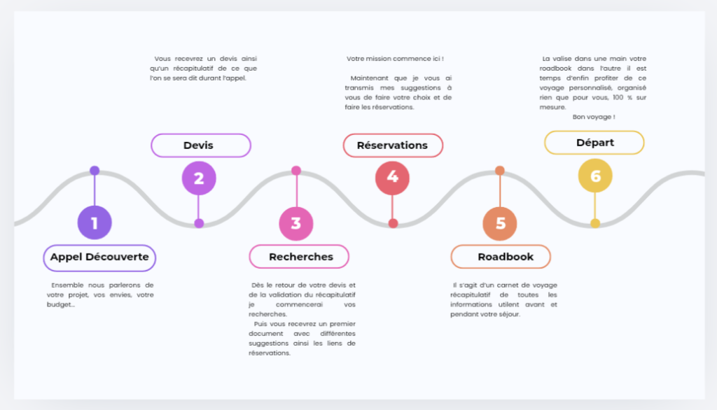 Je vous fais une sélection de choix à chaque étape et vous êtes libre de choisir ce qui vous plait le plus. Ma sélection est faite en fonction de vos critères il n’y a aucun partenariat avec les prestataires sur place juste quelques avis et recommandations sur ceux que j’ai déjà pu tester.